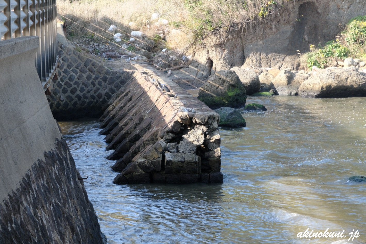 水門は海側の壁面が垂直で湖側は傾斜面となっています。逆流を防ぐための水門だったので、水の流れを遮断する"門"があったはずですよね。どこについてたのだろう? それとももともとはL字だったということなので、勢いをとめるような水路になっていたのかな??