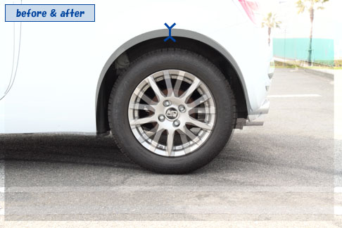 リアのフェンダーとタイヤの隙間を比較してみます。全体と同様に上が純正時、下がプロキット交換後です。