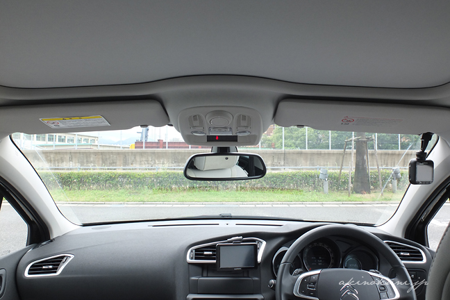 何が「手強い」のかというと雨滴センサー。C4はルームミラー後ろに雨滴センサーが「で~ん」と鎮座しており、その存在を主張しています(汗)。そのためにドライブレコーダーをルームミラー後ろに取り付けると、運転席側の録画エリアに対し障害となってしまうのです。