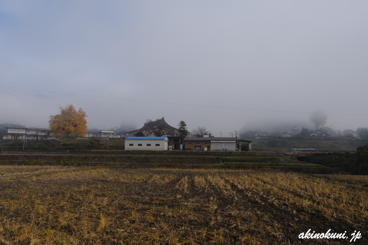今日も山ノ内駅を訪れたときと同じように結構早い時間に家を出発しました。そのため、布野小学校についたのは9時30分頃でしたが、道中の霧が凄かった(汗)。このページ最初の写真は現地に到着してしばらく経った10時前に国道54号そばから撮ったものです。到着直後に同じ場所で撮ったのは下の写真でした(^^(^^;。