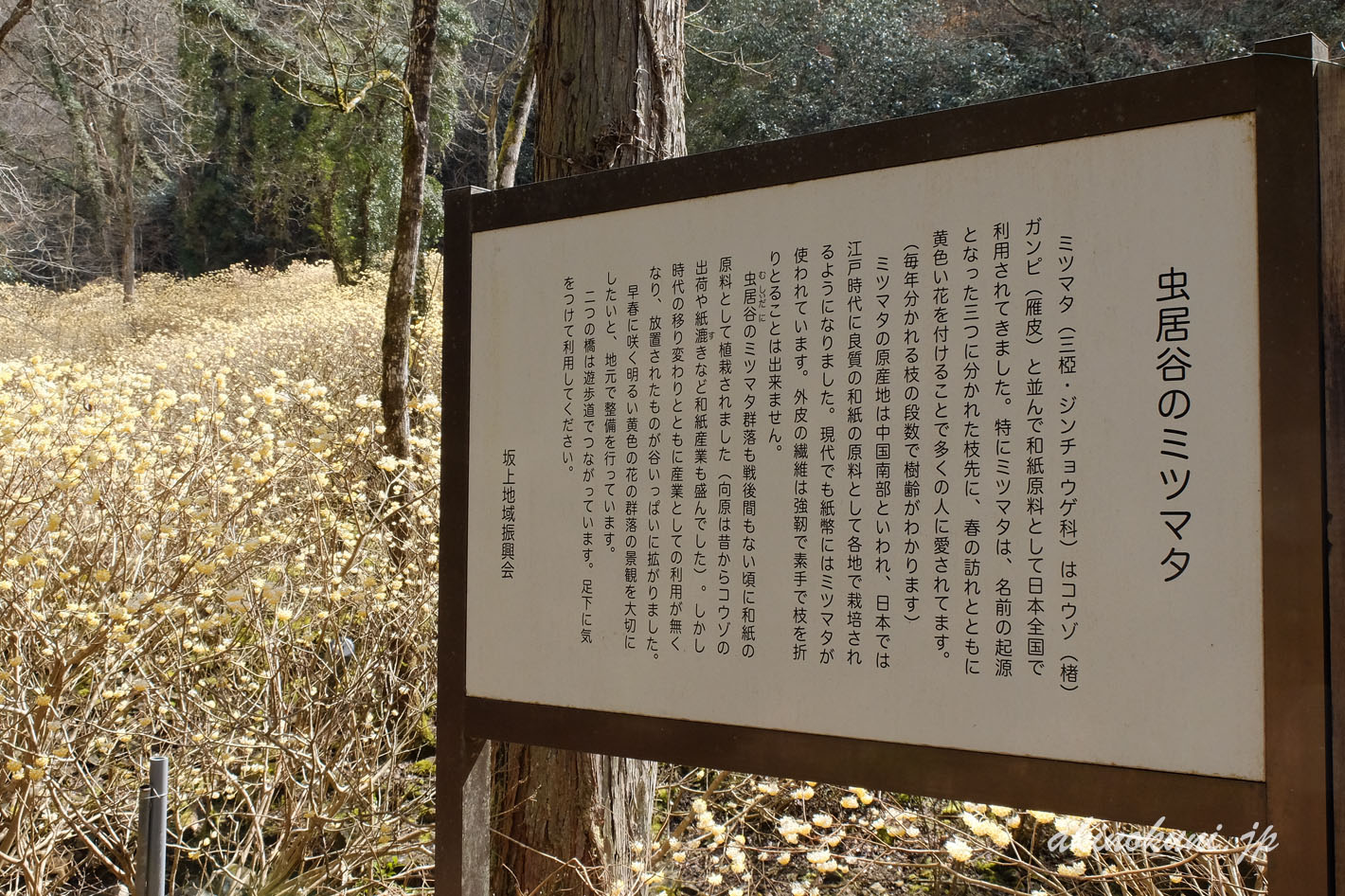 虫居谷のミツマタ群生地も戦後間もない頃に和紙の原料として植栽されました。(向原は昔からコウゾの出荷や紙漉きなど和紙産業も盛んでした)。しかし時代の移り変わりとともに産業としての利用が無くなり、放置されたものが谷いっぱいに拡がりました。 早春に咲く明るい黄色の花の群落の景観を大切にしたいと、地元で整備を行っています。 二つの橋は遊歩道でつながっています。足元に気をつけて利用してください。