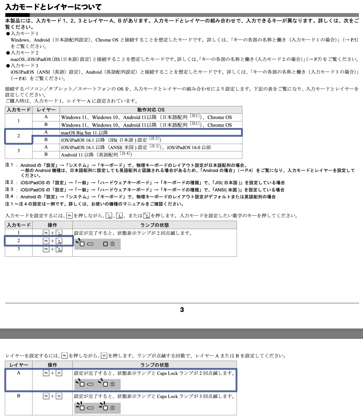Macで使うときは、"入力モード2、レイヤーA"にするのが正解のようです。しかし、この"補足情報"、Macユーザーがよりによって(^^;富士通のキーボードを購入するのはかなり少数派なのでしょうが、"キーボードに同封しておいてくれてもよいのでは?"と感じるのはMacユーザーのわがままでしょうか(汗)。