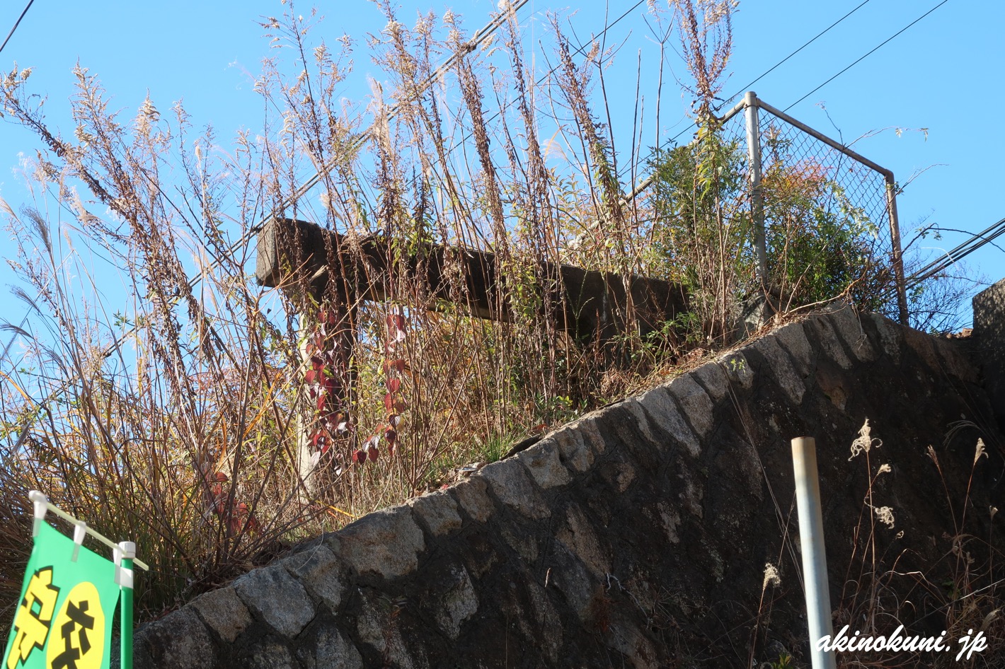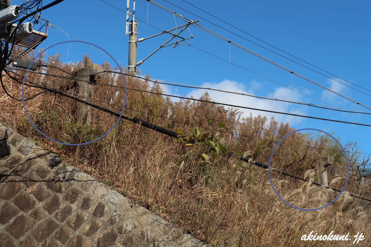 この土台が残っているのは国道31号線の魚見山隧道のあたり。魚見山隧道から川原石駅方面に向かう方向になります。ここにはもうひとつ土台があります。