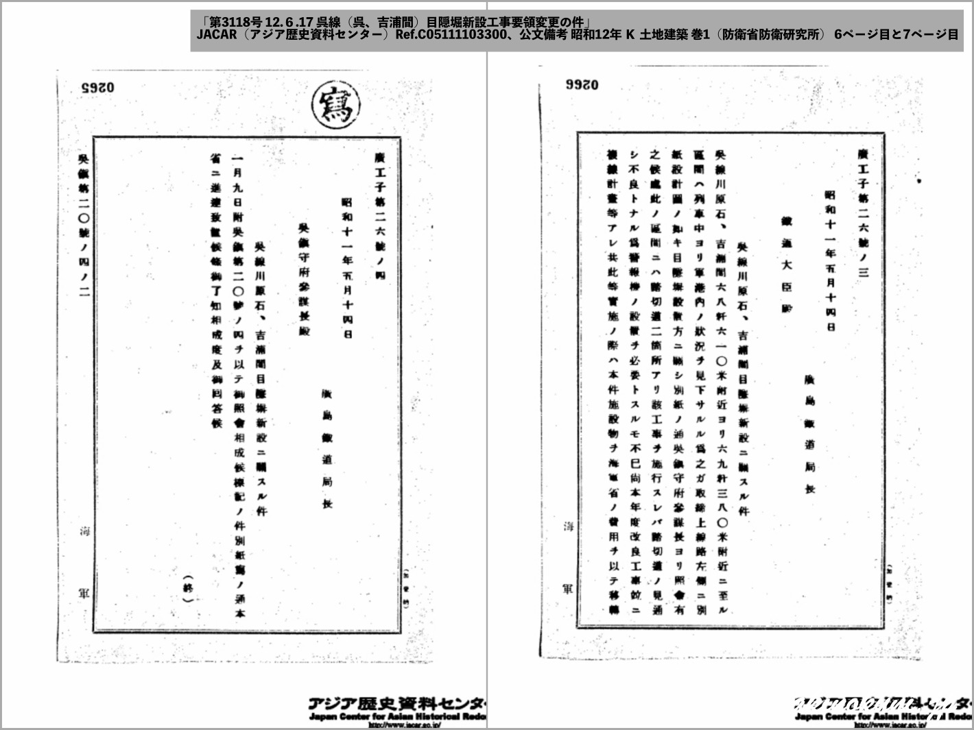 - 「第3118号 12.6.17 呉線(呉、吉浦間)目隠塀新設工事要領変更の件」JACAR(アジア歴史資料センター)Ref.C05111103300、公文備考 昭和12年 K 土地建築 巻1(防衛省防衛研究所) 6ページ目と7ページ目