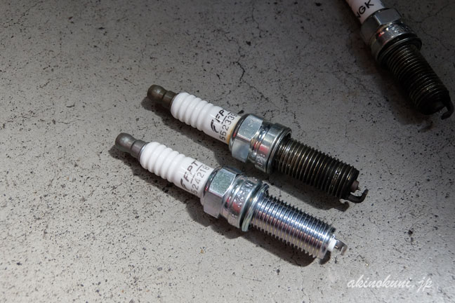 上が交換したスパークプラグ、下が新しく装着したスパークプラグです...って、見れば一目瞭然ですね(^^;。作業にお邪魔して説明していただいたのですが、プラグについては品番がかわっています。写真でもその型番が違うのがわかるかと。この新しいスパークプラグは対策品という扱いではなく、型番がかわっているということでした。また、主体金具というのでしょうか、そこに記されている番号も異なっていると。